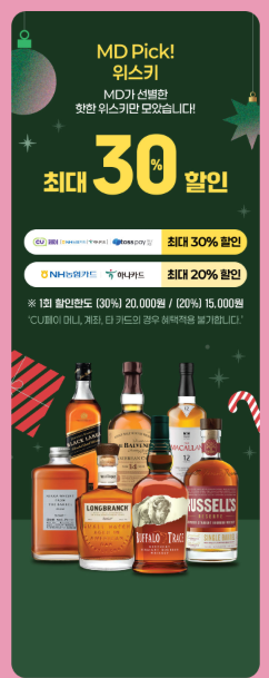 | MD Pick 위스키 할인 | 12월 한 달 | 최대 30% 할인 | NH농협카드 / 하나카드 | 할인 한도 존재 |