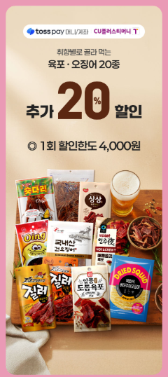 | 육포·오징어 20종 할인 | 12월 | 20% 할인 | Toss Pay / CU플러스티머니 | 1회 4,000원 한도 |